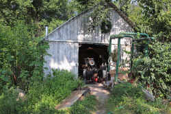 The whole place is overgrown. Yard work was halted temporarily so that more time could be spent on finishing shop floor and house repair projects. Now the shop looks like an old abandoned homestead discovered in a forgotten forest. While we were stuffing the power hammer through the front entrance we expected the steel shoeing stock to slide out of the way as we shoved the hammer past it. But the shoeing stock snagged on the loader boom and dragged itself further into the entrance area, now listing sideways and down low in front. Going to be a large effort to clear out the weed growth and junk that got dragged with it and then move the shoeing stock back out of the entrance. However it does seem to add more character to that abandoned forgotten homestead look.