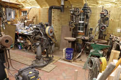 How has renovation work changed the shop environment so far? Even though renovation is only partially complete at this time, these improvements are far better than originally planned. One of the biggest problems was the lack of insulation and inability to heat the shop during the coldest part of winter. Even with renovation only partially complete, it is far easier and more economical now to heat the shop. This means workshops and seminars can be offered during the winter. Winter is actually a great time to for workshops and seminars because it is easier to control temperature, quite unlike summer. During winter, if the shop is too warm, simply open the doors enough to cool the shop down. If too cold, close the doors and let the fires warm it up again. Inusulation in the roof has also greatly improved summer tempertures inside the shop for at least a few hours longer each day. Outdoor summer heat can't be stopped, but the heat radiated down through the roof as a result of summer sun is greatly reduced. I have not worked a forge inside the shop yet, so I don't truly know how heat from the forges will affect shop temperature during summer. This is why I am currently planning worshops and seminars for fall, winter, and spring. Any type of roof mounted ventilation to remove trapped hot air during summer events will have wait until next year.