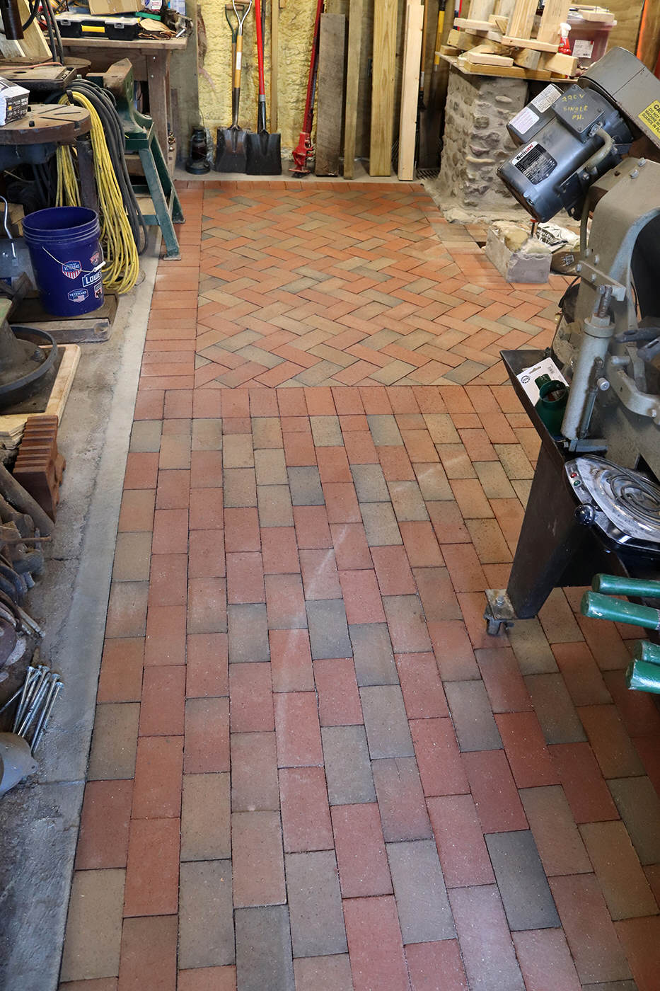 eyes into the shop. A 45-degree herringbone brick pattern frames the work area