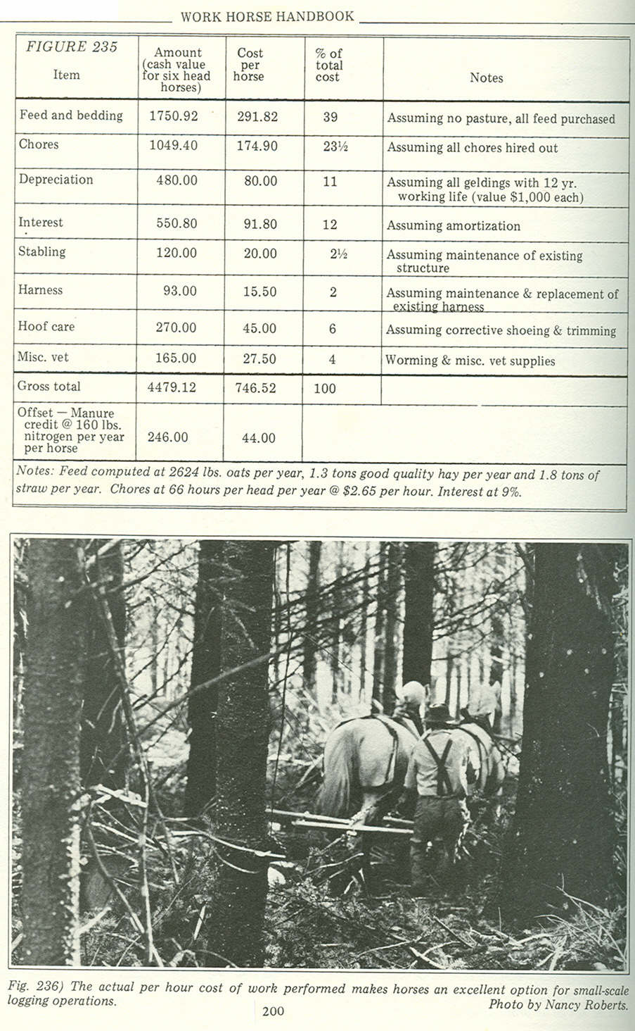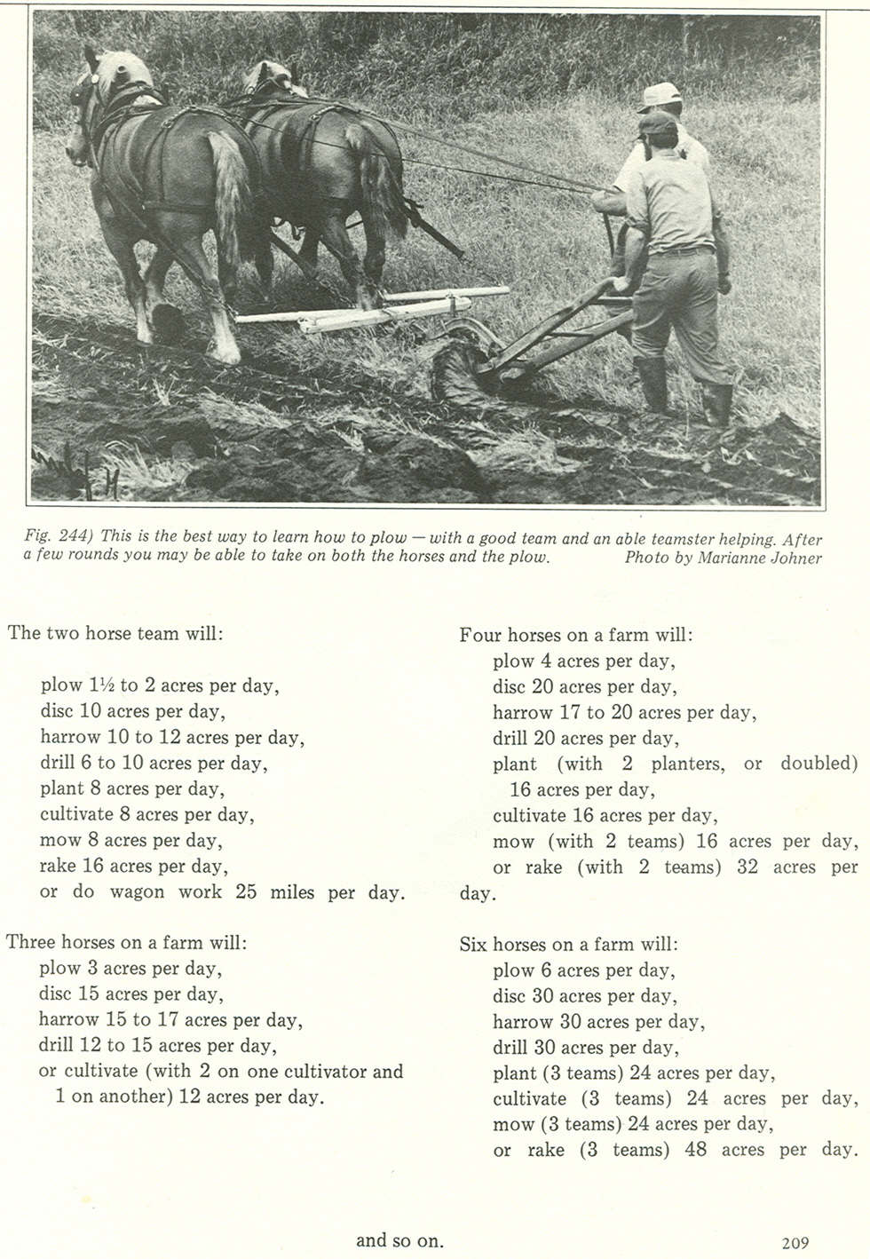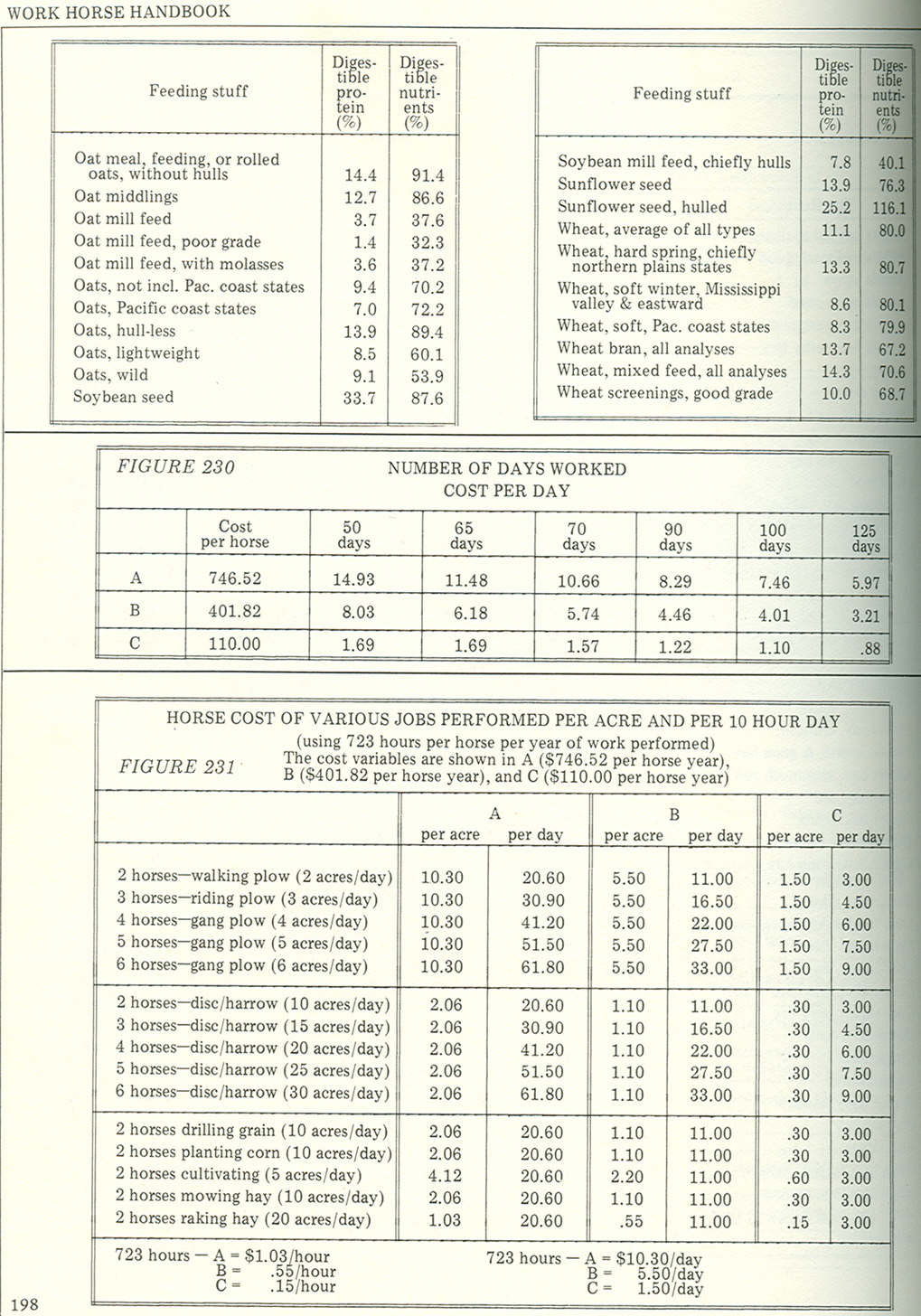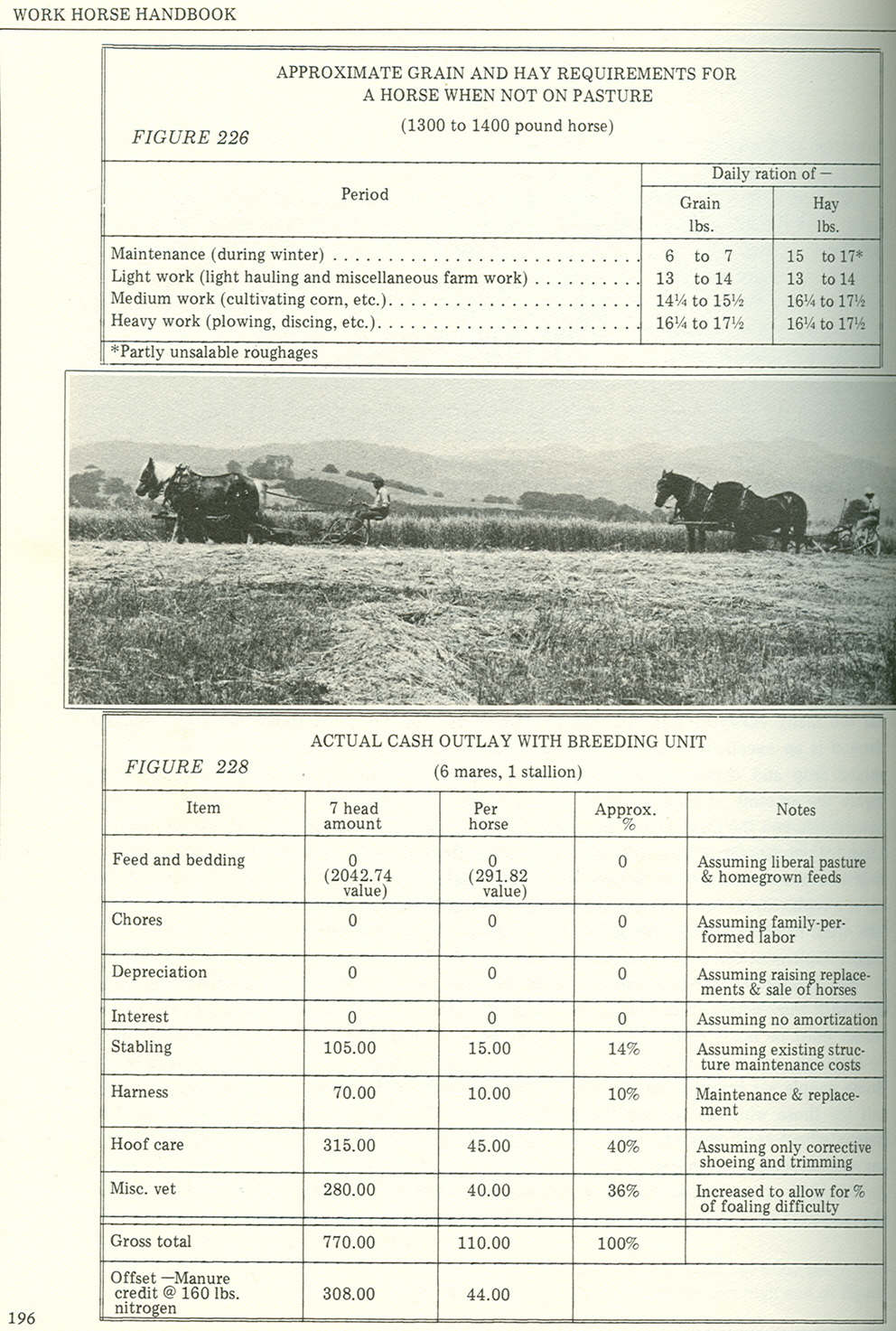 First question someone might have would be how many horses are needed on the farm. The author of the book seems to agree with the 1921 census and offers the estimate that a mixed power farm would need something like one horse per 18-24 acres. In the old days that meant that a 160 acre farm with maybe 120 acres tillable might need 6 horses as an example. All feed would be raised on the farm. The only costs might be shoeing and vet bills and harness and repairs for some equipment.