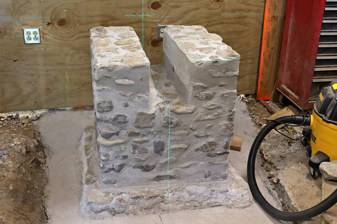 layer of chimney and front pedestal started, and concrete subfloor layer poured