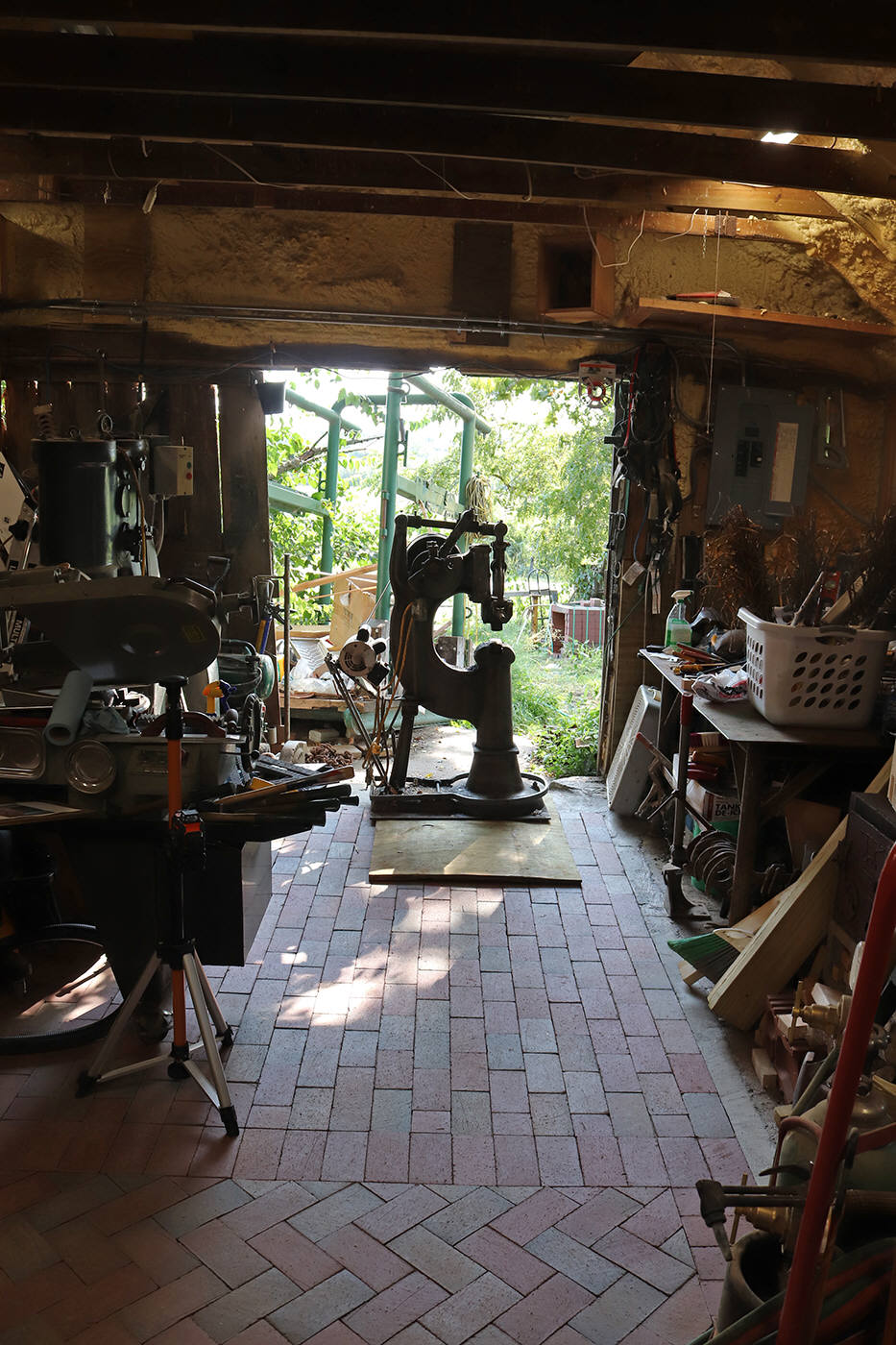 eyes into the shop. A 45-degree herringbone brick pattern frames the work area